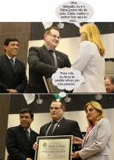 Os cliques são desta quarta-feira, quando o delegado-chefe da 16.a SDP, Amir Roberto Salmen, foi à Câmara para receber a Comenda 10 de Outubro dada à delegacia de Campo Mourão. A homenagem foi entregue pelo autor da proposta, vereador Sidnei Jardim, junto com a prefeita Regina Dubay. E que fique claro: com a polícia tão perto, todo mundo se comportou bonitinho...
