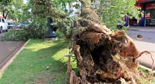 Uma árvore do canteiro central caiu nesta segunda-feira à tarde na av. Manoel Mendes de Camargo, perto do hospital Interclínicas. Por sorte, a queda foi apenas sobre o canteiro e não atingiu ninguém. Quem pagou o pato foi um poste republicano que ficava ao lado.