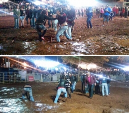 Com a chuvarada, acrescida do rodeio, ninguém teria coragem de entrar na arena de rodeio para ver mais de perto o show com Gilberto & Gilmar, certo? Errado. Teve gente que não tava nem aí pro lamaçal. Uma fã chegou a ficar, literalmente, atolada e precisou de ajuda dos colegas. Ah, tava atolada, mas tava bão...
