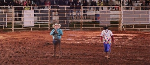 A lama que tomou conta da arena de rodeio, no primeiro dia de rodeio da Festa Nacional do Carneiro no Buraco, não perdoou nem o experiente locutor Giovany Araújo. Corre pra cá, corre pra lá, ele acabou caindo no meio do barro. Aí ficou desse jeito: todo sujo pela lama. Ah, vai que a lama do parque é medicinal...