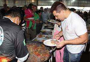 Apesar da chuva em praticamente todos os dias da festa, quem não faltou no Parque de Exposições foram os ex-BBBs. Olha aí o vencedor deste ano, Cezar Lima, experimentando o prato típico.