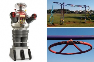 Olha o Robô de “Perdidos no Espçao” de volta à Boca Santa. Agora ele balança os braços de borracha e alerta “perigo” para um dos brinquedos do Parque do Lago. Aliás, o único que restou (parcialmente ainda) da “academia da primeira idade”. As argolas que as crianças usam para se pendurarem estão enferrujadas. Portanto, antes que isso vire uma ATI - Academia do Tétano Infantil...