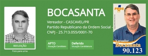 Em Campo Mourão isso soaria como brincadeira, mas é verdade. Bocasanta é o nome de vereador eleito (reeleito na verdade) em Cascavel. Fez 1.870 votos na eleição de domingo, concorrendo pelo PROS. Detalhe: Bocasanta é nome mesmo, ou melhor, sobrenome. Trata-se de Jorge Luiz Bocasanta, de 50 anos.