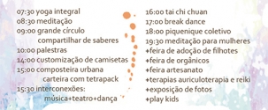 Acontece neste domingo, na Praça do Fórum, o 1º Encontro da Primavera de Campo Mourão. A programação vai das 7h30 às 20h30 (atenção para o horário de verão) e inclui palestras, meditação, yoga, tai chi chuan, música, dança, teatro e oficinas, entre outros (veja acima). O objetivo é unir a comunidade e promover à cultura da paz, a arte, saúde e ecologia.