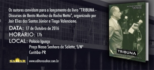 O historiador mourãoense Jair Elias dos Santos Jr vai lançar segunda-feira, em Curitiba, o livro “Tribuna – Conferências de Bento Munhoz da Rocha Netto”. Será às 17h, no Palácio Iguaçu. Isso mesmo: lançamento no Palácio Iguaçu. A obra foi escrita a quatro mãos – o outro autor é Tiago Valenciano – e traz discursos do ex-governador. O livro já teve lançamento em Maringá. Agora será a vez da capital.
