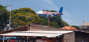 Campo Mourão pode não ter linha aérea comercial, mas agora tem um avião em “voo permanente” pela cidade. É o avião da “Feira do Povo”, no Lar Paraná, que foi instalado semana passada. À noite tem iluminação e tudo. A aeronave, que emita um 747 da Boenig, foi feita em Campo Mourão mesmo com o único objetivo de servir de letreiro para a feira, na av. John Kennedy. Que chama a atenção, chama!