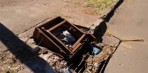 Na rua Cruzeiro do Oeste, perto do posto Andrade, um sofá velho foi usado como tampa de um bueiro. Para dar certo, o sofá foi colocado no local de cabeça para baixo.