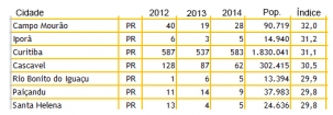 Entre 2012 e 2014, o estudo contou 87 assassinatos na cidade, o que deixa com o índice 32 por 100 mil habitantes.