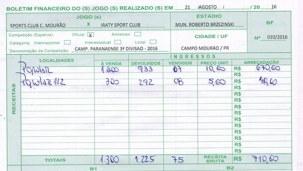 Saiu o borderô do primeiro jogo do Sport, este ano, no estádio Roberto Brzezinski. Foi pela segunda rodada da Terceirona. Foram 75 pagantes – 67 ingressos a R$ 10 e oito a R$ 5 (meia), o que somou uma renda de R$ 710. O prejuízo administrativo da partida foi de R$ 4 mil. Na primeira rodada, quando teve de jogar em Paranavaí, o Sport teve renda de R$ 30, com três pagantes. Ah, também, Paranavaí...