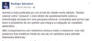 Rodrigo Salvadori (PSD), candidato a prefeito de Campo Mourão, em postagem no Facebook, neste sábado.