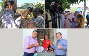 ...pedir voto para todo mundo, mesmo que que seja da porta pra fora ou do outro lado do muro. Da esquerda para direita, de cima para baixo: Rodrigo Salvadori (PSD), Regina Dubay (PR) e Nelson Tureck (PEN); e Tauillo Tezelli e Beto Voidelo (PPS), candidatos a prefeito a vice-prefeito de Campo Mourão.
