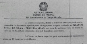A juíza eleitoral Gabriela Borri Aranda proibiu a divulgação dos resultados da pesquisa do Instituto Visão.