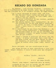 Após a derrota na eleição para prefeito, em 1976, Luiz Gonzaga Oliveira, publicou o “Recado do Gonzaga”, em que comentou o pleito daquele ano. “A maior decepção da minha vida, até hoje”, escreveu num dos tópicos. “Tiao e bênção à política. Só serve para canalhas – é minha conclusão!”. Foram quatro candidatos em 1976 e Gonzaga ficou em quarto lugar. O prefeito eleito foi Augustinho Vecchi.
