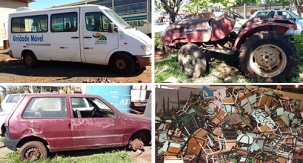 Quem tal comprar uma van Sprinter 98/99 que serviu a Secretaria de Saúde de Campo Mourão? Ou a sucata de um Fiat Uno? Ou um trator Agrale 4230? Esses itens vão a leilão no próximo dia 30 (9h). Tem mais mais de dois mil itens escolares, como carteiras e cadeiras quebradas, além de equipamentos para escritório, hospitalares e odontológicos. Tem ainda 150 toneladas de lenha.