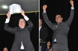 Foram diplomados nesta terça-feira os prefeitos, vice-prefeitos e vereadores eleitos em Mamborê e Boa Esperança. Olha a alegria dos prefeitos eleitos Ricardo Radomski (Mamborê) e Zé do Caixão (Boa Esperança) ao receberem seus diplomas. O prefeito anfitrião, Nei Calori, que perdeu a eleição para Radomski, prestigiou o evento.