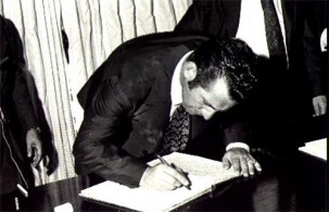 31 de janeiro de 1973. O advogado Renato Fernandes Silva assina o livro de transmissão de cargos no gabinete da prefeitura. A posse aconteceu no Cine Plaza, onde hoje funciona a igreja Universal.