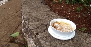 Tem de tudo pelos canteiros centrais de Campo Mourão. Até marmita. Intacta! A foto foi feita nesta quarta-feira, na esquina da av. Capitão Índio Bandeira com a rua São Paulo (uma espécie de Ipiranga com av. São João mourãoense). A marmita foi deixada aberta no local, com carne e tudo. Vá entender...