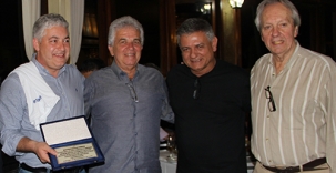 Quem disse que só o presidente da Coamo, José Aroldo Gallassini, recebe homenagens? O secretário de Estado Douglas Fabrício (Esporte e Turismo) foi homenageado segunda-feira pela Confraria dos Amigos da Bola, formada por membros da imprensa esportiva e ex-jogadores de futebol. Douglas recebeu a placa do vereador de Curitiba Hélio Wirbiski, que jogou no Atlético/PR na década de 1970. Entre os presidente, o ex-jogador Edu Coimbra, irmão de Zico.