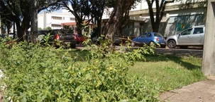 Mato vai tomando conta do canteiro central da av. Irmãos Pereira, esquina com rua Francisco Albuquerque, no centro de Campo Mourão.