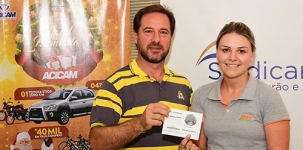 Michele Nath, que concorreu por ter abastecido no posto Vian. Ela foi sorteada nesta quarta-feira, ganhando uma Suzuki GS 120. Foi a primeira de quatro motos da campanha Natal Premiado Acicam. Mais três motocas serão sorteadas nos próximos dias 14 e 21 e em março. Além disso haverá o sorteio de um carro Etios 0 km dia 28. A campanha tem ainda 30 bicicletas e R$ 40 mil distribuídos em 550 vale-compras.