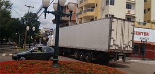 Por volta do meio-dia desta quinta-feira, carreta passa pela av. Manoel Mendes de Camargo, no centro de Campo Mourão.