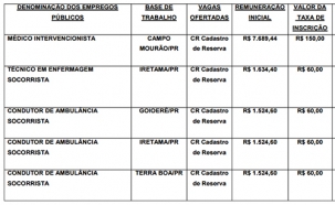 Na região não há vagas, apenas cadastro de reservas para Campo Mourão, Goioerê, Iretama e Terra Boa.