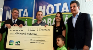 Douglas Willian Rodrigues, vendedor da Força do Aço, em Campo Mourão, ganhou R$ 50 mil da Nota Paraná. É aquele programa do governo do Estado que do “CPF na Nota”. Foi o maior prêmio no 14º sorteio do programa. Rodrigues recebeu o “checão simbólico” na quarta-feira, em evento com a presença do governador Beto Richa e tudo. O sortudo disse que pretende trocar de carro e guardar o restante.