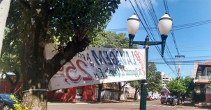 “No centro de Campo Mourão (av. Irmãos Pereira), faixa com promoção de empresa tem uma ponta amarrada na árvore pública e outra no poste republicano.”