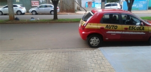 “Carro de autoescola mostrando como não estacionar na frente de entrada e saíde de veículos, na av. Manoel Mendes de Camargo, centro de campo Mourão”.
