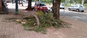 Os galhos de uma árvore do calçadão caíram no domingo. Até esta quinta-feira eles continuavam depositados na esquina da av. Capitão Índio Bandiera com rua Francisco Albuquerque.