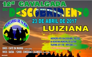 Luiziana – Será realizada no dia 23 de abril a 12ª Cavalgada do Descobrimento, que deve reunir cerca de 500 cavaleiros e amazonas. O percurso será de 14 km. A promoção é da prefeitura e as inscrições podem ser feitas até o dia 20. Mais informações – (44) 3571-1768 ou 9 9910-2885 ou pelo e-mail cultura@luiziana.pr.gov.br.