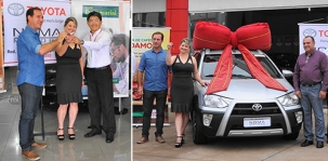Foi entregue nesta quinta-feira, na Noma Motors, o Toyota Etios Cross 0 km que foi sorteado no fim de ano através da campanha Natal Premiado Acicam. A sorteada Iria Nogara recebeu as chaves e a documentação do veículo do presidente da Acicam, Paulo César Gomes. O carro custa R$ 59 mil. A campanha ainda tem uma moto a ser sorteada. O sorteio será dia 17 de março. Outras três “motocas” já foram entregues pela promoção do comércio.