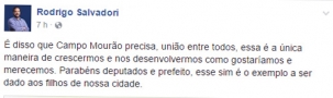 O candidato a prefeito derrotado Rodrigo Salvadori usou as redes sociais para elogiar o encontro do prefeito Tauillo Tezelli com o governador Beto Richa, acompanhado do deputado estadual Márcio Nunes. Salvadori reproduziu a nota de Boca Santa que mostra o encontro, que também teve a presença do secretário Douglas Fabrício, e enalteceu a união dos políticos adversários. "Parabéns, deputados e prefeito, esse sim é o exemplo a ser dado aos filhos de nossa cidade", escreveu.