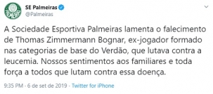 O Palmeiras usou o Twitter, nesta sexta-feira, para lamentar a morte do mourãoense Thomas Bognar, aos 34 anos. Ele lutava conta a leucemia. Thomas jogou no juvenil do time paulista. Como profissional, atuou no Aereb, de Engenheiro Beltrão, na primeira divisão do Paranaense. Antes de adoecer, jogava no time amador de Luiziana. Deixou mulher e duas filhas.