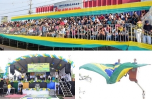 Várias cidades da região promoveram este ano o desfile de 7 de Setembro. Em termos de estrutura montada, Terra Boa humilhou. Teve até arquibandada montada na avenida. E olha só o tamanho do palanque das autoridades. O hasteamento da Banderia Nacional foi feito com guindaste. Teve soltura de balões verdes e amarelos e o prefeito Valter Peres "nos trinques", de terno e gravata.