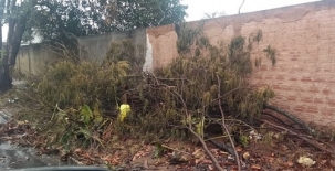 Galhos de árvores jogados sobre a calçada na rua Mamborê, em frente a subestação da Copel, em Campo Mourão.