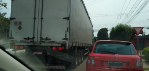 Carreta passa em frente a escola da Vila Urupês, nesta sexta-feira, bem na hora da saída das turmas. Caos total no trânsito da cidade.