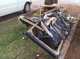 "Restos de sofá há muito tempo em canteiro de rua do conjunto Cohapar, em Campo Mourão".