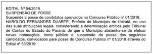 A prefeitura de Ubiratã publicou nesta quinta-feira a suspensão da posse de 17 servidores aprovados em concurso.