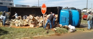 Caminhão carregado com caixas de óleo de cozinha tomba, na manhã desta terça-feira, na saída para Maringá, em Campo Mourão.