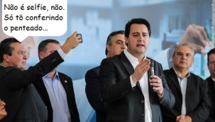 O clic é de quarta-feira, no Palácio Iguaçu, em Curitiba. O governador Ratinho Jr discursa em evento sobre a liberação de recursos para compra de medicamentos, enquanto o secretário de Estado Márcio Nunes (Desenvolvimento Sustentável e Turismo) aproveita para uma selfiezinha...