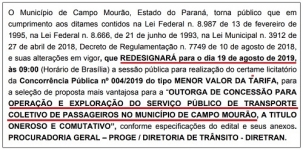 Não saiu nada desmarcando, portanto, está valendo a data de 19 de agosto para a licitação da circular de Campo Mourão.