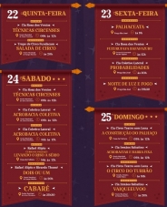 Saiu a programação oficial definitiva do 12º Festival de Circo de Campo Mourão, Começa quinta-feira e vai até domingo. Serão seis estetáculos e e oficinas. Também estão programadas as tradicionais Palhaceata, Cabaré e Noite de Luz e Fogo no centro da cidade. Tudo de graça.