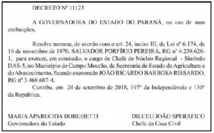 A mesma portaria nomeou Salvador Porfírio Pereira como novo chefe.