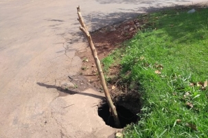 Av. Mguel Luiz Pereira, entrada da av. Comendador Norberto Marcondes. O buraco existe faz tempo. Agora, ao menos, está "sinalizado".