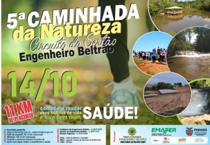 Que tal aproveitar o feriadão para uma caminhada de 11 km entre trilhas e estradas rurais? Então fique ligado. Acontece domingo (8h) a 5.a Caminhada Internacional na Natureza em Engenheiro Beltrão. É o circuito Caminhada do Sertão. A saída será no distrito de Sertãozinho. A promoção é da Emater e da prefeitura. Para participar não paga nada, mas há opcionais como café da manhã (R$ 10) e almoço (R$ 20).