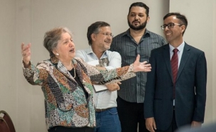 O lançamento do novo livro de Jair Elias dos Santos Jr, quarta-feira, terminou com a execução do Hino de Campo Mourão. Isso com a presença da autora da melodia, a professora Walkyria Boz. Ela está com 80 anos e mora em Curitiba. E olha a animação dela na hora do hino. Também estão na foto o prefeito Tauillo Tezelli, o autor Jair Elias e o presidente da Academia Mourãoense de Letras, Fabio Sexugi (vereador em Peabiru).