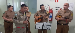 Integrantes da banda de música da Polícia Militar do Paraná estiveram domingo na Santa Casa de Campo Mourão. Fizeram apresentações para pacientes internados. O quarteto de chorinho incluiu no repertório músicas nacionais conhecidas pelo público, que cantou e se emocionou junto dos militares. A ação, promovida pelo 11º BPM, faz parte das comemorações pelos 164 anos da PMPR.
