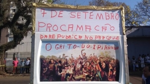 O vendedor de pipoca que foi a desfile de Sete de Setembro, em Campo Mourão, não saiu de casa sem antes dar uma decorada no carrinho. Conseguiu imagem do "Grito do Ipiranga" e tudo. Só se atrapalhou com as datas. Sete de Setembro é dia da Independência, nãoda Proclamação da República (15 de novembro). Tem uns errinhos de português também, mas digamos que valeu a intenção...