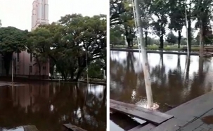 A Catedral ao fundo não deixa dúvidas. Essa é praça São José, no centro de Campo Mourão, no final da tarde desta sexta-feira. Virou um rio. Ou melhor: virou um piscinão. Foi muita chuva num curto espaço de tempo. No mais, só faltaram os meegulhos, porque os flashes estavam por lá...